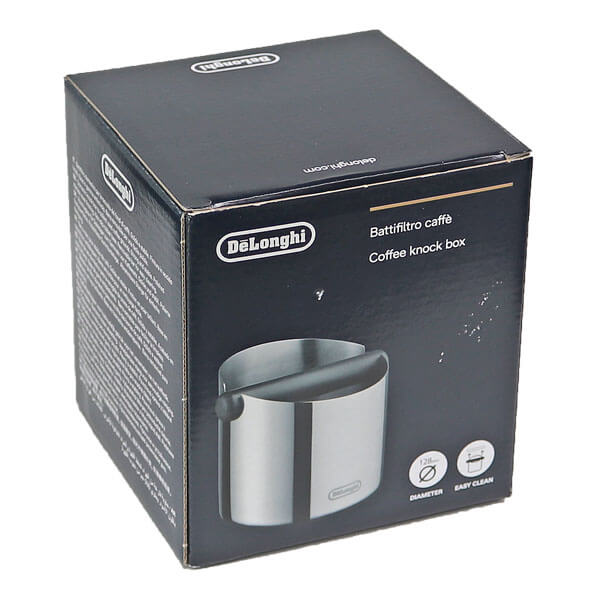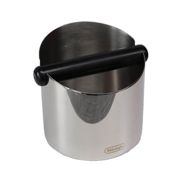 DeLonghi Abklopfbehälter aus rostfreien Edelstahl wird mit aufgedrucktem Hersteller Logo und einem rutschfesten Gummiboden geliefert.